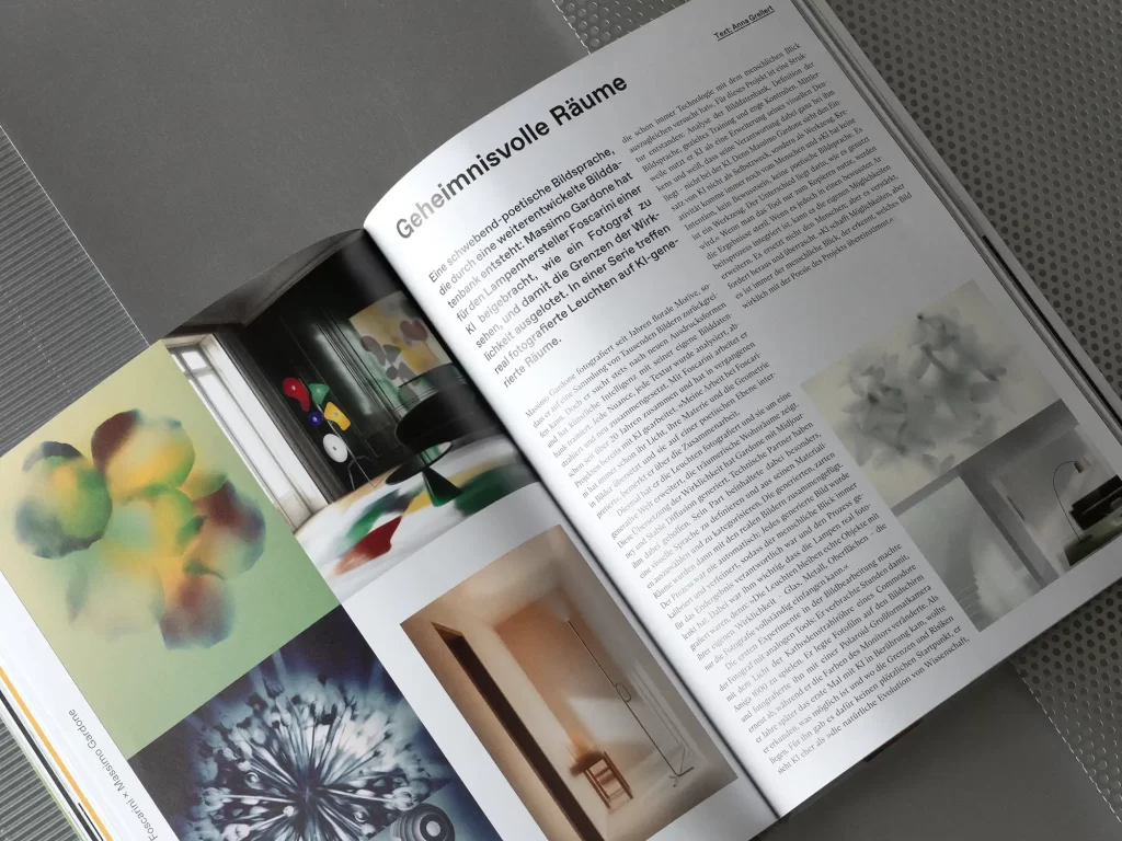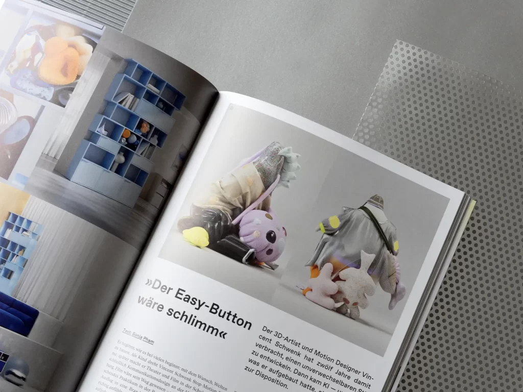 Das Cover-Motiv wurde von Vincent Schwenk in einem hybriden Workflow entwickelt. Der 3D-Künstler trainierte ein LoRA-Modell mit seinen Arbeiten, sodass die KI seine Bild- und Formensprache verstand und daraus eine Grundkomposition kreieren konnte. Er sagt: »KI generiert, Maschinen eröffnen Möglichkeiten und Designer treffen Entscheidungen. So schreiben wir nicht nur Prompts, sondern erschaffen echte Workflows.«
